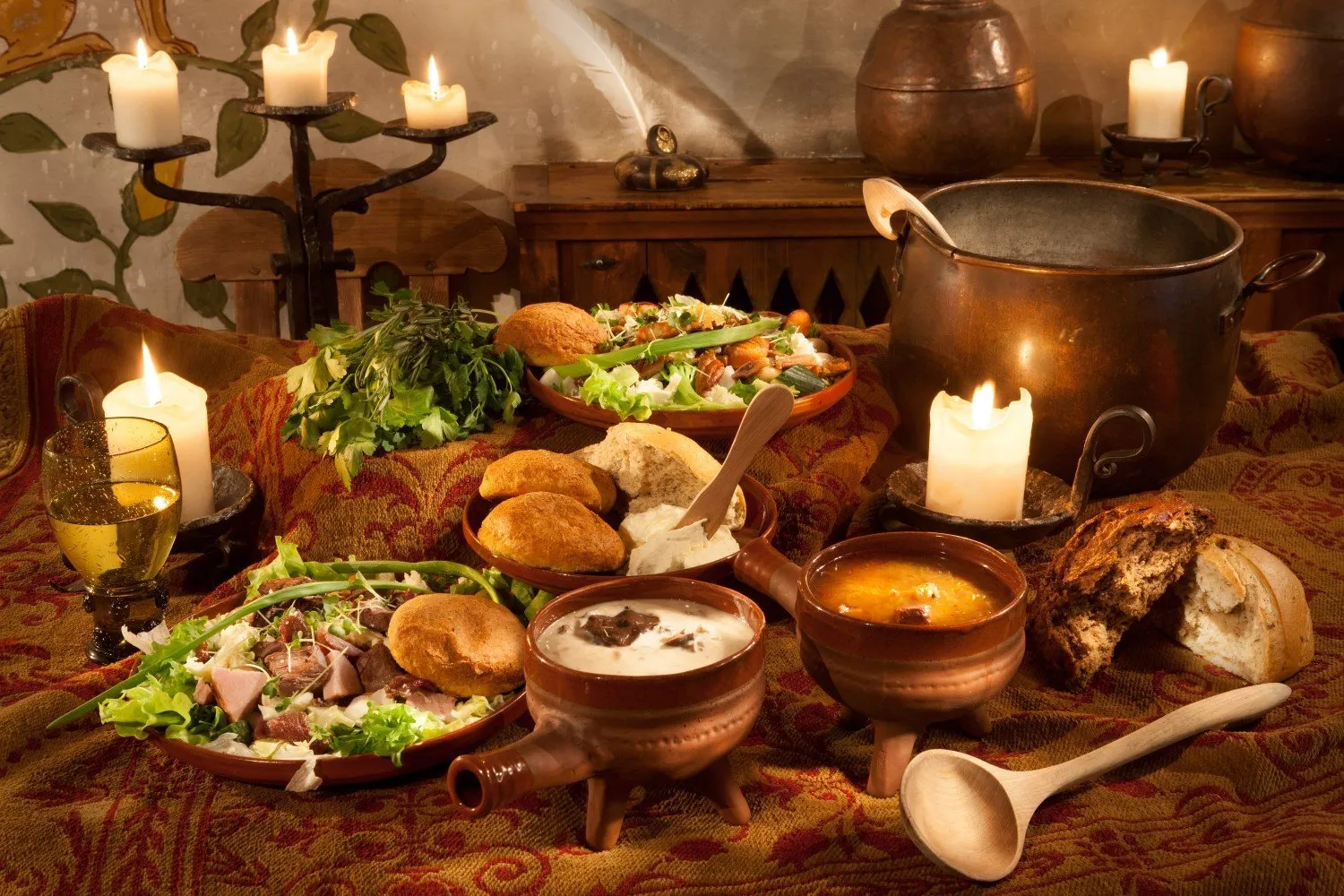 В древнерусских поселениях стол воспринимался как центр дома. Перед началом еды часто произносили благодарственные слова, а первые куски хлеба могли посвящаться духам предков. Пища сопровождала все важные события: свадьбы, рождение детей, праздники урожая, поминальные дни и военные собрания.